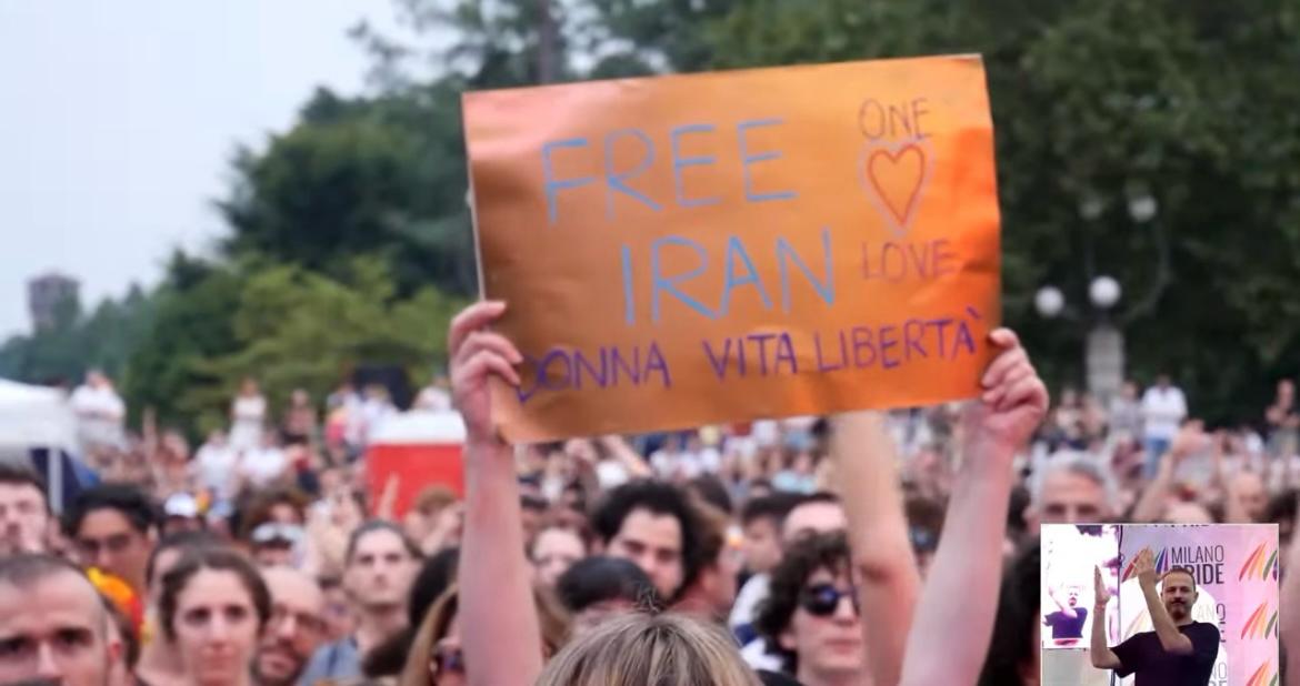 Un pensiero speciale all’Iran, dopo le elezioni di ieri, un paese tormentato dal regime della Guida suprema, dove non esistono diritti, per nessuno. Tra i manifestanti spunta un cartello con scritto Free Iran.