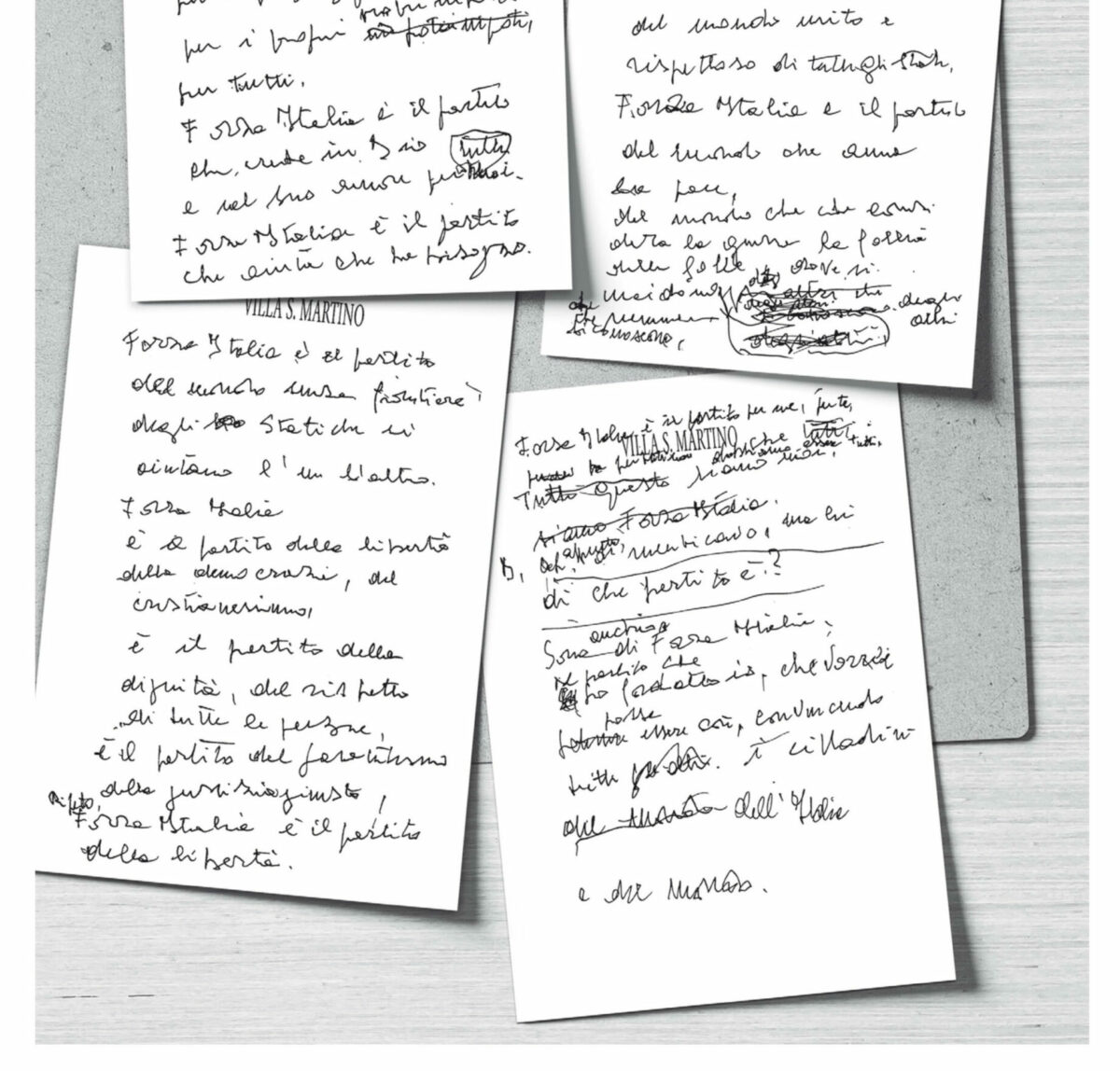 Il 'testamento politico' è stato scritto al San Raffaele di Milano nel pomeriggio di sabato 10 giugno, due giorni prima che Berlusconi morisse. Il Cavaliere si fa delle domande e si dà risponde, nella prima definisce Forza Italia come "il partito del cuore, dell'amore per i propri figli e nipoti, per tutti":
