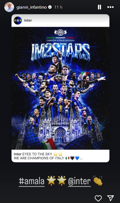 A celebrare la vittoria dello scudetto dell’Inter c’è anche il presidente della FIFA Gianni Infantino, che non ha mai nascosto la sua fede nerazzurra. L’illustre tifoso dell’Inter – nato in Svizzera, ma di origini italiane, i suoi genitori infatti sono di origini calabresi – ha pubblicato una storia sul proprio profilo Instagram con l'immagine del club stilizzata con il Duomo di Milano e i giocatori attorno e la scritta: