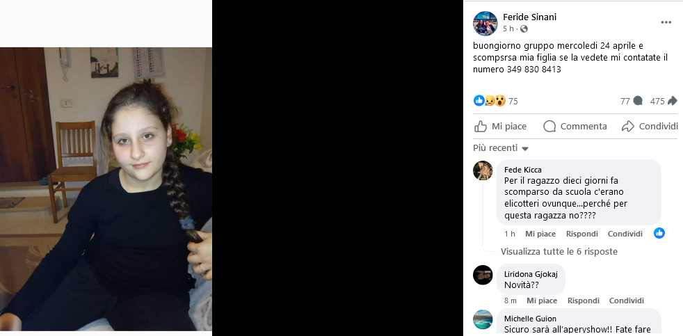R. "Ritengo possa essere stata rapita. Non posso dirle nulla sull'indirizzo esatto, ma è stata localizzata in dai carabinieri in una casa nelle vicinanze. Sono andata direttamente lì personalmente, ma nessun passante l'ha vista, purtroppo. Però il cellulare avverte che è in quella strada. Sono preoccupata che possa essere accaduto qualcosa. Dopo tre giorni ritengo che qualcuno la stia mantenendo economicamente ed ospitando".