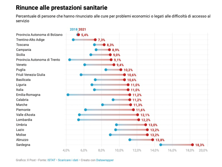 Rinuncia: Un dato ricorrente nei rilievi degli ultimi anni è dato dalla significativa percentuale di quanti rinunciano alle cure mediche, a partire dalle analisi mediche necessarie ai fini della prevenzione, ma pure della cura. Si parla di percentuali intorno al 10% . Tempi lunghi e costi non sostenibili sono alle origini del fenomeno, che naturalmente interessa le fasce più fragili della popolazione, innanzitutto quelle a basso reddito, con più bassa formazione culturale, quelle di età più avanzata, tutti fattori che spesso si combinano.