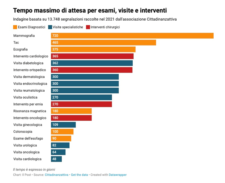 Secondo il Rapporto 2022 di Cittadinanzattiva, nel sistema sanitario pubblico è necessario attendere 720 giorni per una mammografia, 375 per un’ecografia, un anno per una TAC, 6 mesi per una risonanza magnetica. Per visite diabetologiche, dermatologiche o reumatologiche non si scende sotto i 10 mesi. Non va meglio per gli interventi chirurgici: in cardiologia e ortopedia bisogna attendere almeno un anno. Fino a 6 mesi per un intervento oncologico.