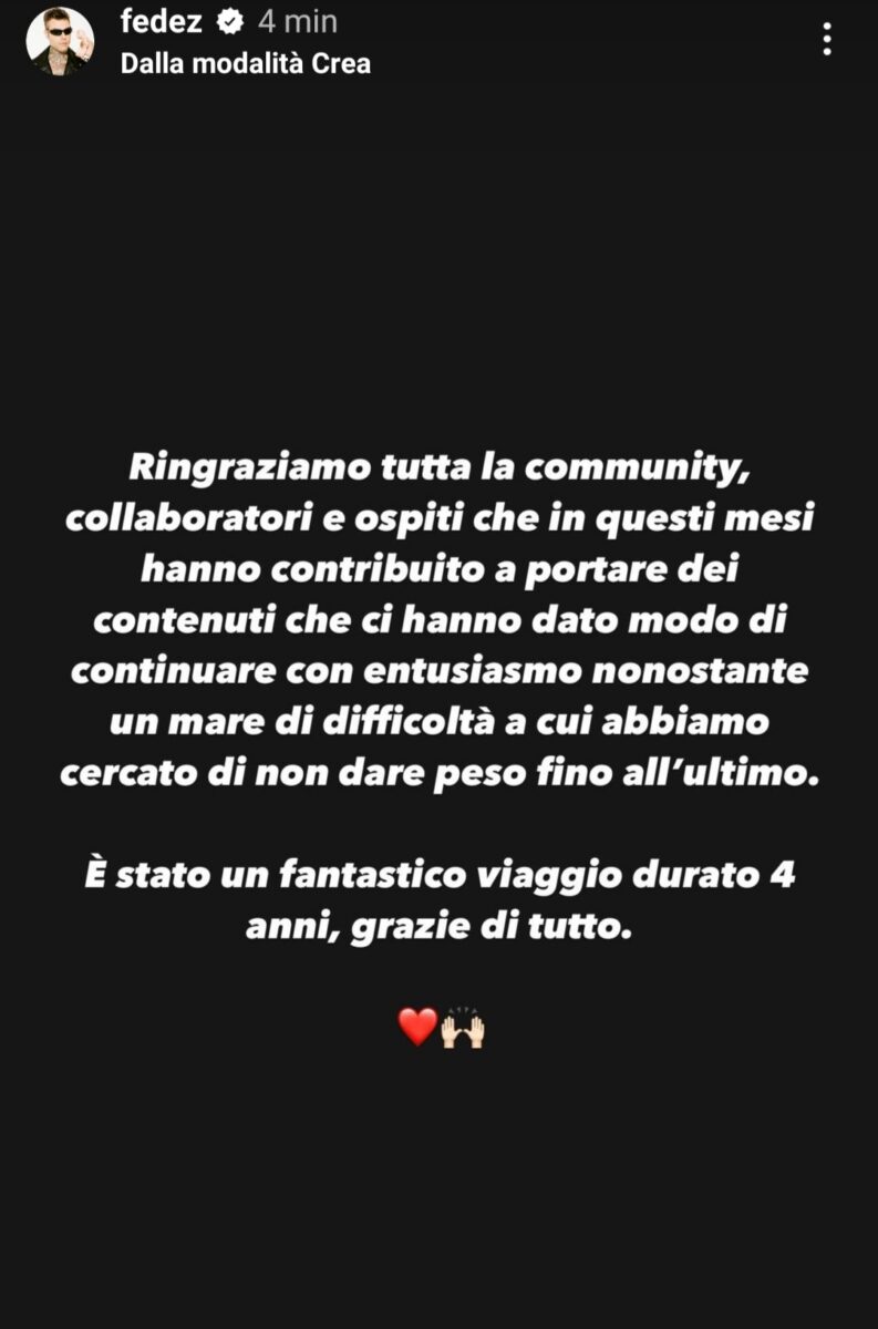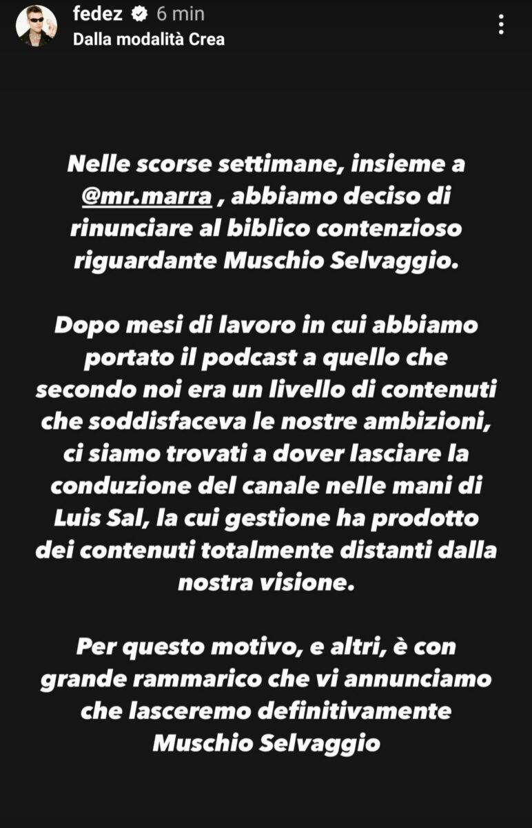 Di qui la decisione di lasciare in modo definitivo il podcast Muschio Selvaggio non senza prima ringraziare le persone che lo hanno supportato in questa avventura. Fedez ha infatti concluso: