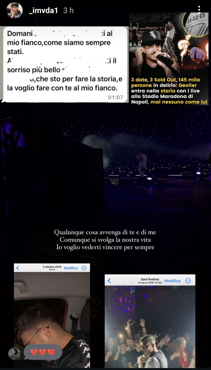 Valeria ha aggiunto anche degli scatti privati: in uno si legge un messaggio inviatole da Geolier che diceva di voler fare la storia affianco a lei, in un altro scatto c’è l’artista impegnato nel 2019 in uno dei suoi primi concerti e poi ancora un post che riporta il clamoroso successo ottenuto dall’artista allo Stadio Diego Armando Maradona dove si è esibito in tre tappe sold out.