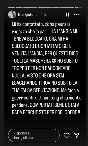 Tornando alla lite social, Lino ha poi replicato che Alessia è falsa, ma che prima o poi le sue maschere cadranno. Non a caso potrebbe raccontare tutto quello che ha fatto nei suoi confronti e che se inizia a parlare è la fine per lei. In una Storia che poi però ha cancellato (e di cui vi mostriamo lo screen qui di seguito) ha rivelato che lei l'aveva bloccato e poi sbloccato per dirgli di non raccontare alcun segreto: "Stai esagerando. Ti rovino subito la tua falsa reputazione".