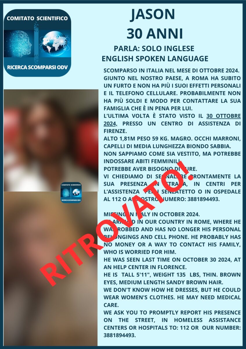 "Jason è arrivato prima nella Capitale, dove è stato derubato dei suoi averi. Successivamente, una volta psicologicamente ripresosi da questo spiacevole evento, sembra aver preso un treno diretto a Firenze. Arrivato lì, si è recato al pronto soccorso cittadino ed è stato aiutato" spiega il CSRC OdV.