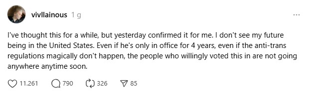 "Pensavo già da tempo di trasferirmi, ma ora ne sono certa. Non vedo il mio futuro negli Stati Uniti," ha scritto Vivian Jenna Wilson su Threads mercoledì, dopo la conferma della vittoria del tycoon, fortemente sostenuto da Musk. "Anche se Trump restasse al potere solo per quattro anni e non venissero approvate misure anti-trans, le persone che lo hanno scelto rimarranno nel Paese ancora per molto," ha aggiunto.