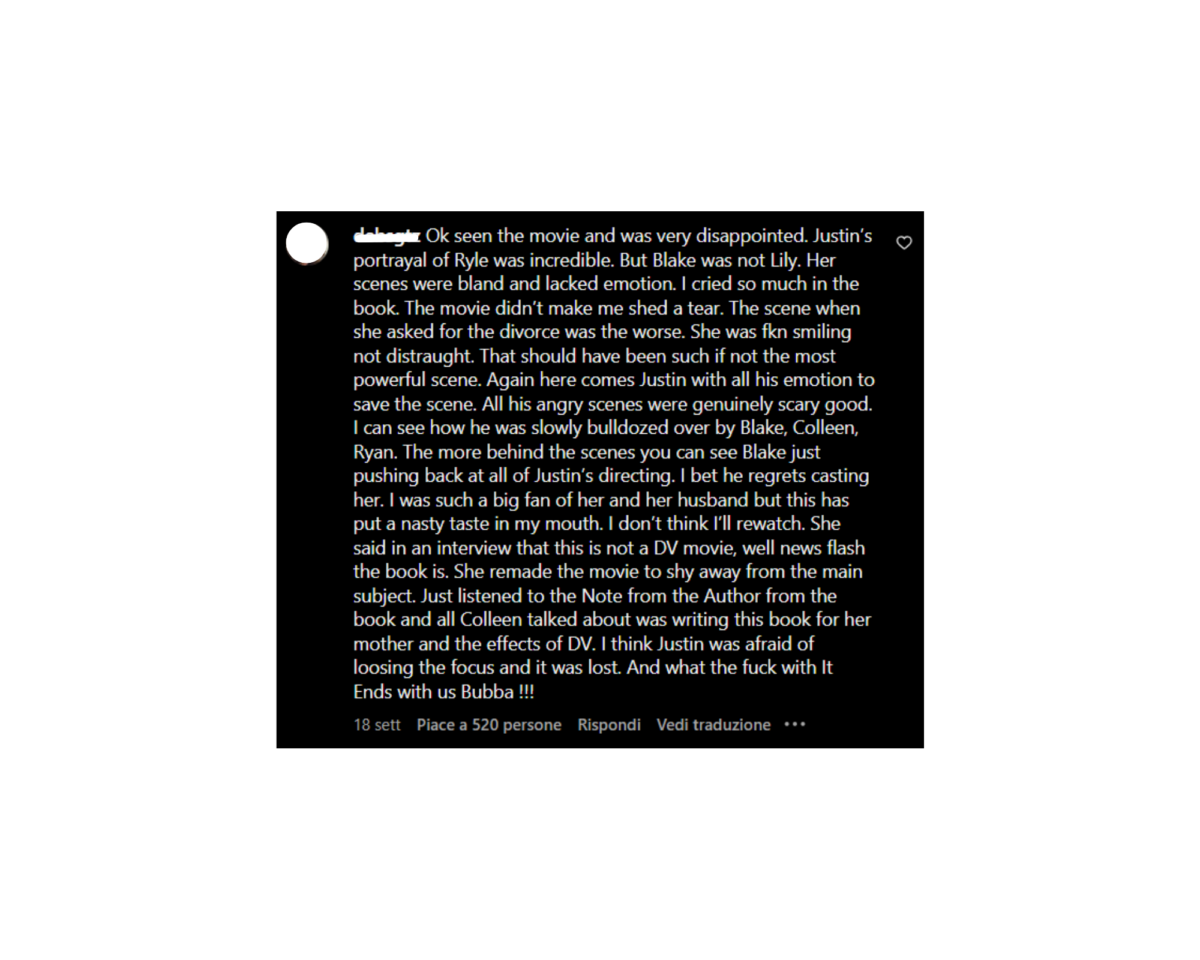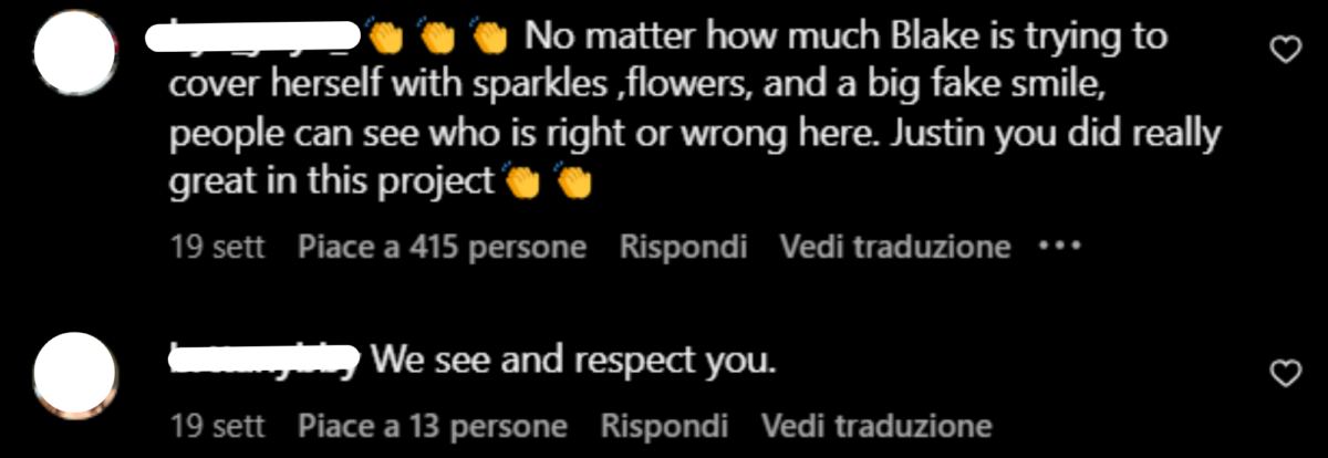 "Non importa quanto Blake stia cercando di coprirsi con scintille, fiori e un grande sorriso falso, la gente può vedere chi ha ragione o torto qui. Justin hai fatto davvero bene in questo progetto" scrive un utente sotto a un post Instagram dell'attore. Mentre un altro commenta semplicemente: "Ti vediamo e ti rispettiamo".