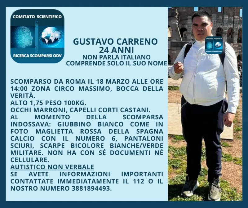 "Gustavo è scomparso ieri alle ore 14 dalla zona del Circo Massimo, più precisamente dalla 'Bocca della Verità', opera situata nell'omonima via", racconta un referente dell'ente no-profit a Tag24.