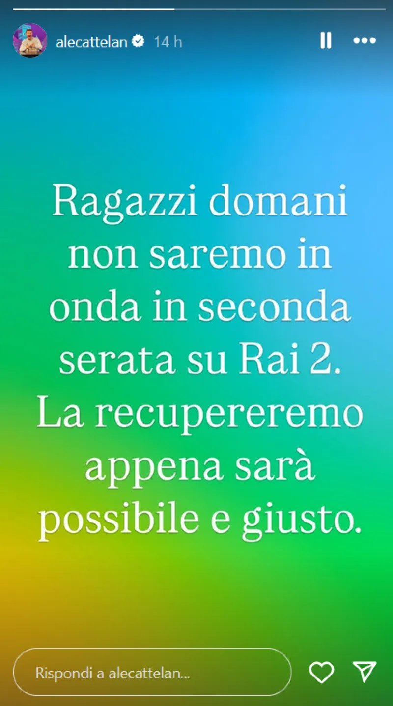 Al momento non è chiaro se l’ultima puntata di "Stasera c'è Cattelan" verrà recuperata nei prossimi giorni o se l’edizione si concluderà così, in modo anomalo, come già accaduto ad altri programmi nelle ultime ore.