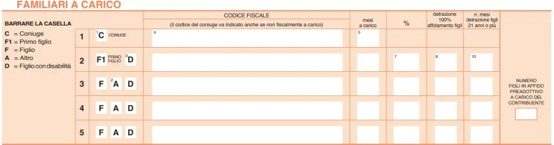 Torniamo subito alla compilazione del modello. Si deve compilare l’apposita sezione del Modello 730/2205 dedicata ai familiari a carico, come vedrai nell’immagine sottostante.