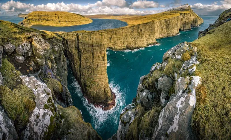L’isola di Vágar, sede dell’unico aeroporto delle Faroe, offre viste spettacolari sul fiordo Sørvágsfjørður e sull’isolotto di Tindhólmur. Dal villaggio erboso di Bøur, sembra davvero di trovarsi nel cuore di un racconto nordico, dove i draghi potrebbero spuntare da un momento all’altro tra le montagne.