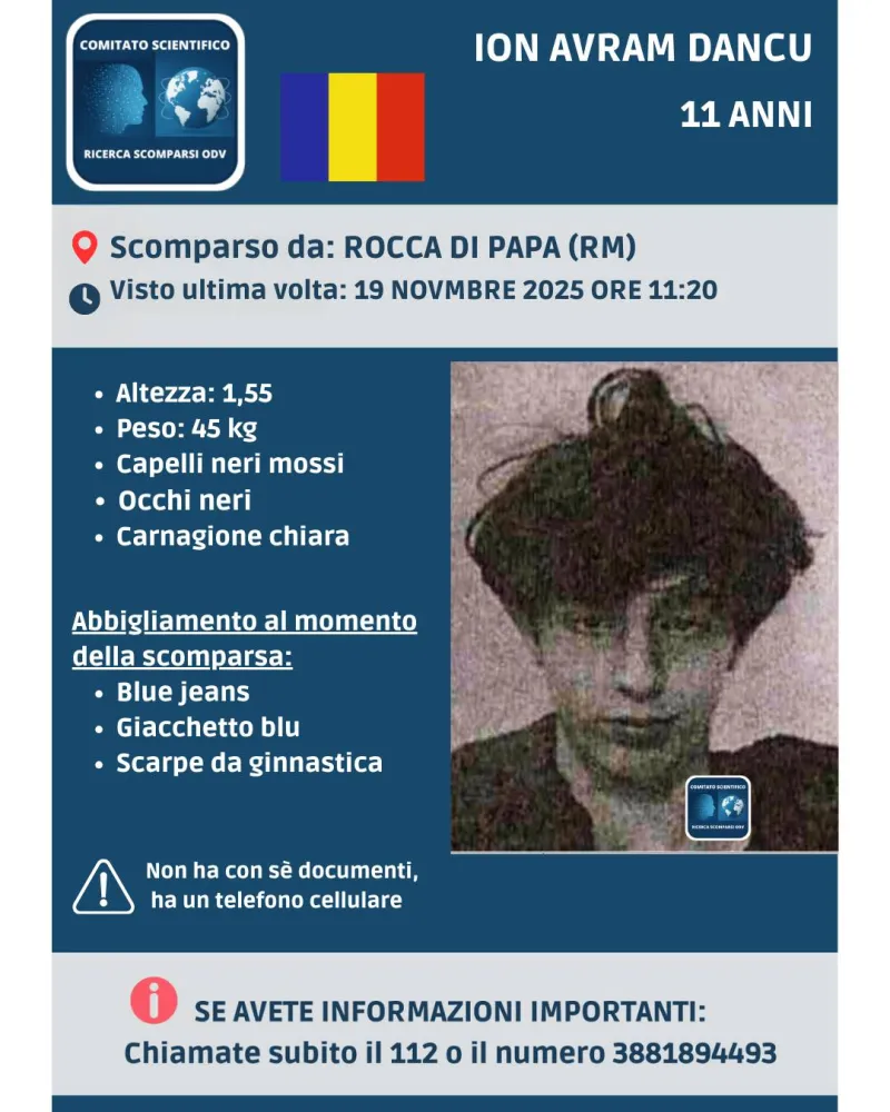 Sono ore di forte apprensione per Ion Avram Dancu, l'undicenne scomparso da Rocca di Papa nella tarda mattinata del 19 novembre 2025.
