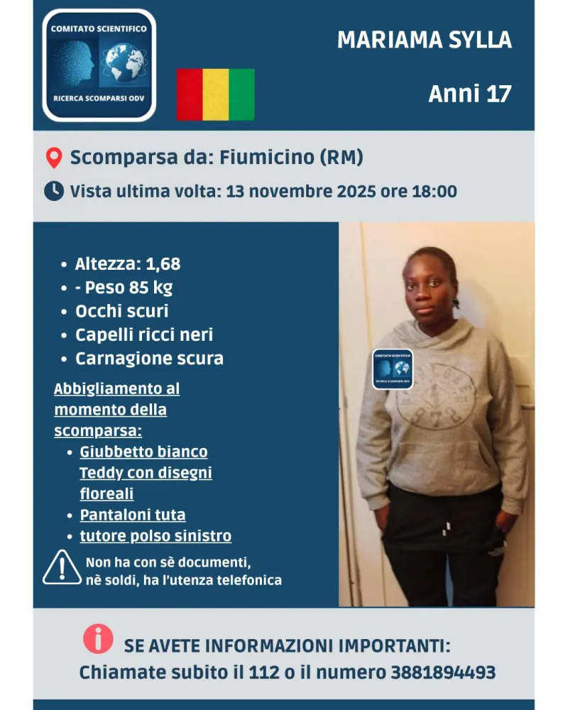 Sono ore di forte apprensione per Mariama Sylla, la diciassettenne originaria della Guinea scomparsa da Fiumicino il 13 novembre 2025.