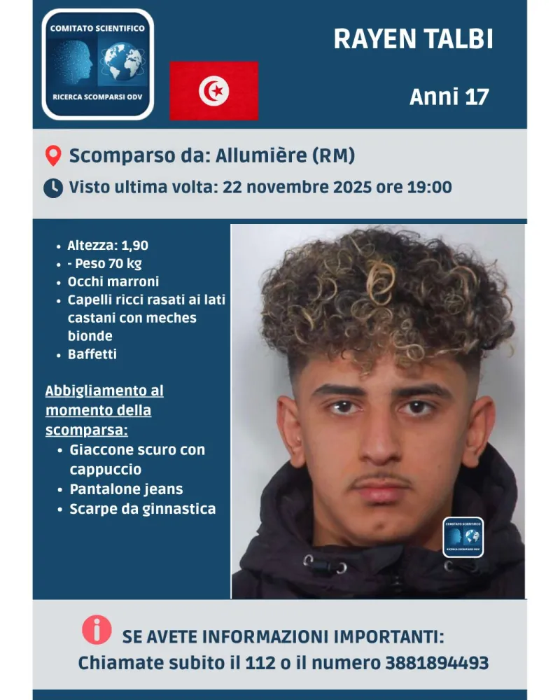 Sono ore di forte apprensione per Rayen Talbi, 17 anni, originario della Tunisia, scomparso dalla struttura di accoglienza di Allumiere, in provincia di Roma, il 22 novembre 2025.