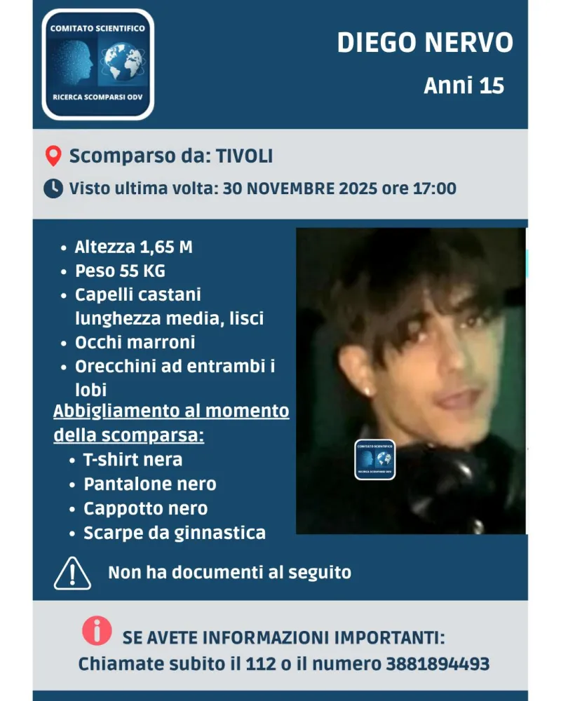 Sono ore di forte apprensione per Diego Nervo, il quindicenne allontanatosi da una struttura di Tivoli e di cui non si hanno più notizie dal 30 novembre 2025.