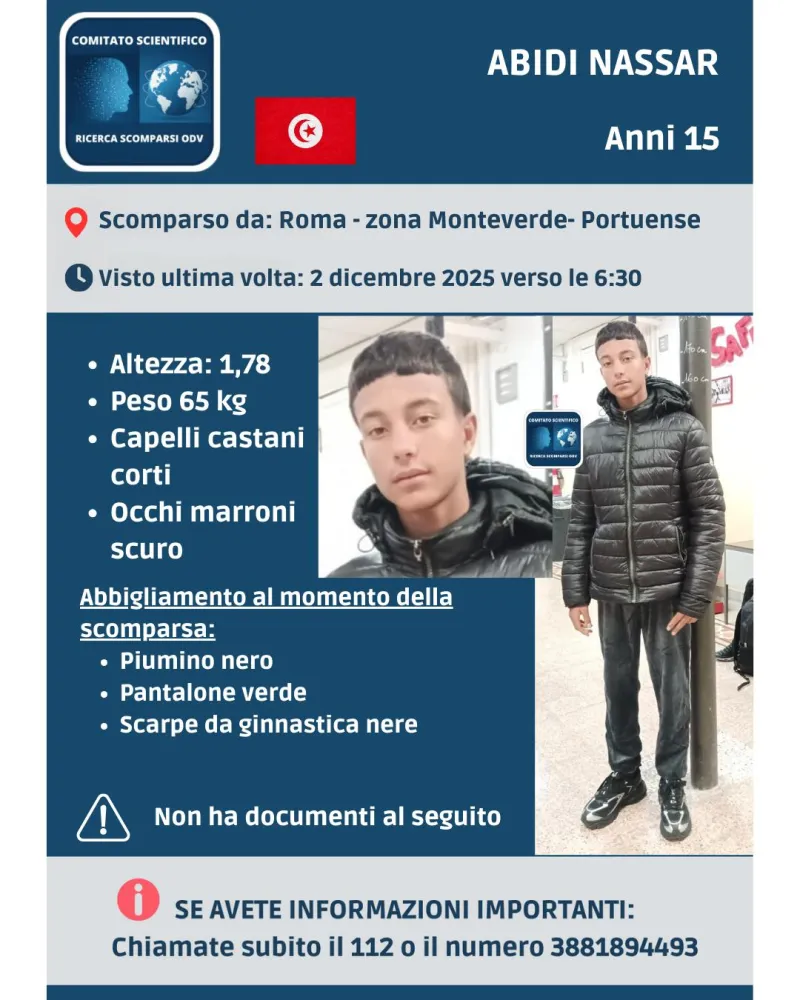 Sono giorni di apprensione per Abidi Nassar, quindicenne scomparso da Roma dal 2 dicembre 2025.