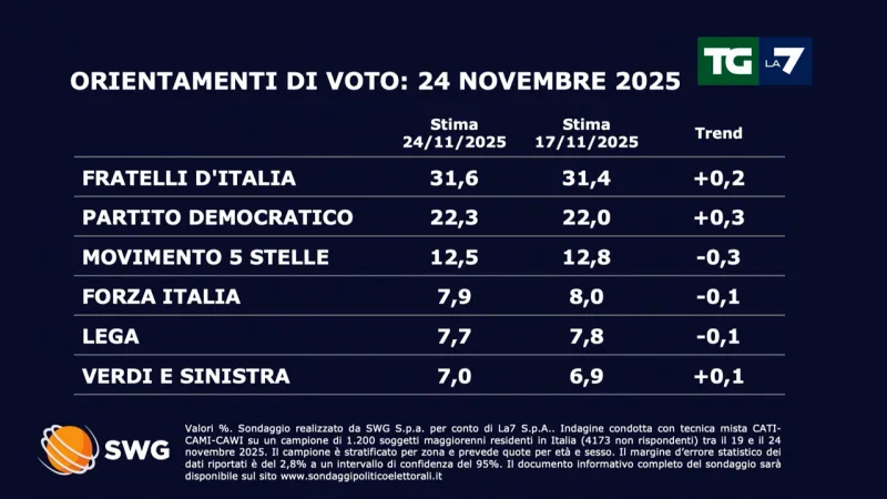 Questo dato conferma una fase di stabilizzazione per il partito guidato da Giorgia Meloni, che dopo mesi di oscillazioni nei sondaggi mostra una sostanziale tenuta del consenso.