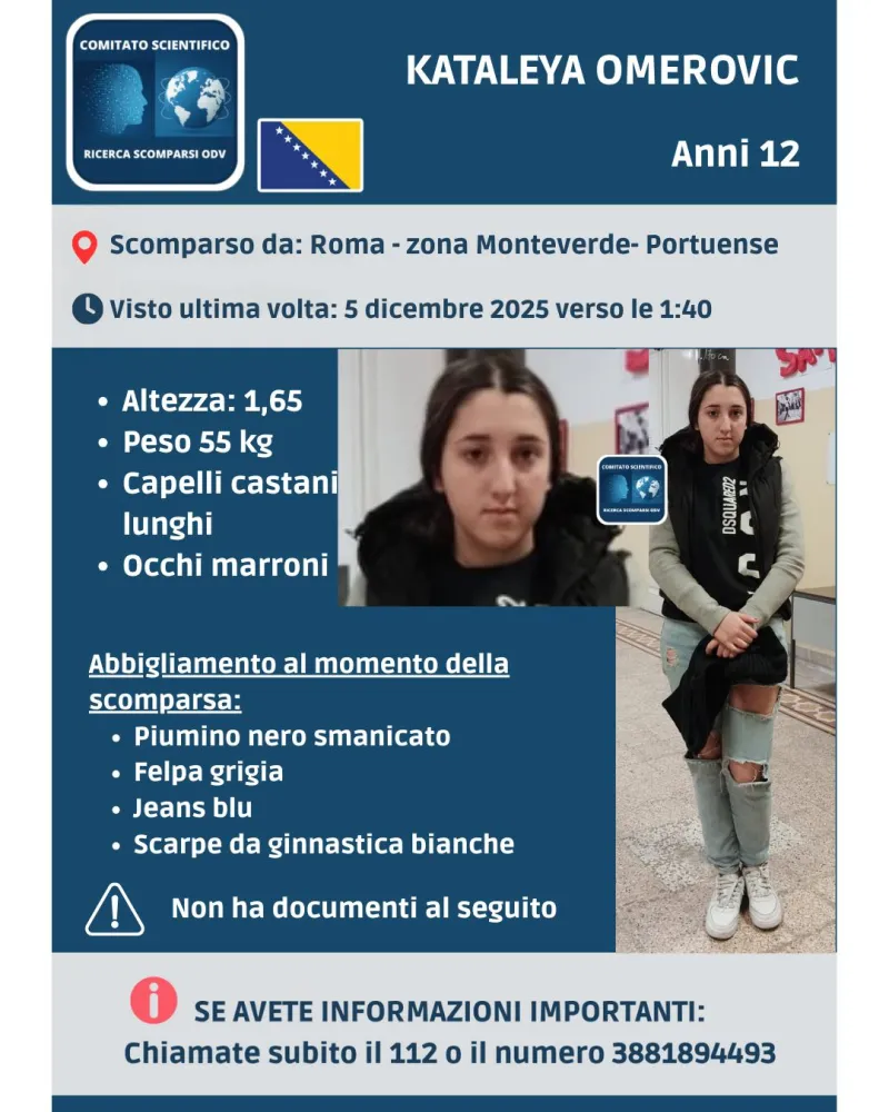 Sono ore di forte apprensione per Kataleya Omerovic, dodicenne di origini bosniache scomparsa a Roma la notte del 5 dicembre 2025, pochi minuti dopo il suo arrivo in un centro di accoglienza situato nella zona Monteverde-Portuense.