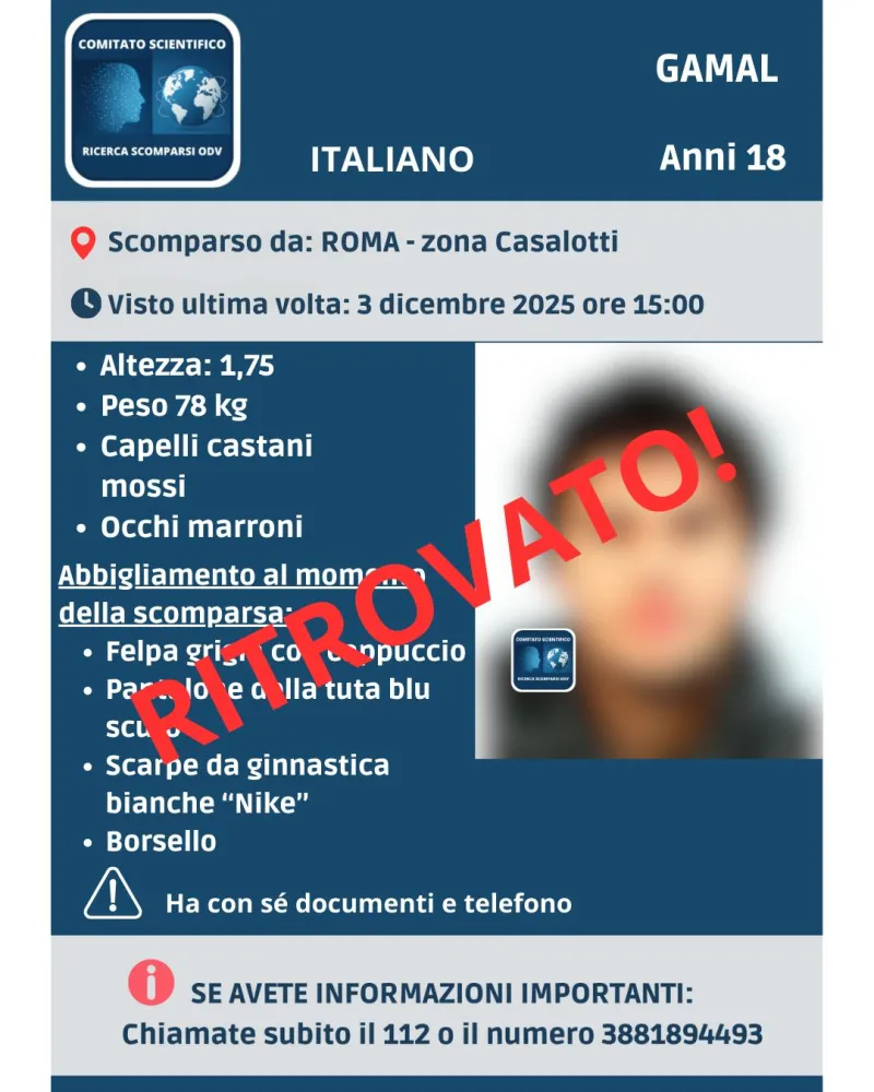 Si è conclusa con un epilogo positivo la vicenda legata alla scomparsa di Gamal Abdel Naby Elkady, il diciottenne che si era allontanato da casa a Roma il 3 dicembre 2025.