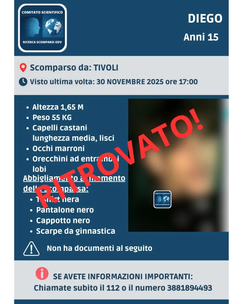 Si è conclusa con un esito positivo la vicenda relativa alla scomparsa di Diego Nervo, il quindicenne che si era allontanato da una struttura di Tivoli lo scorso 30 novembre 2025.