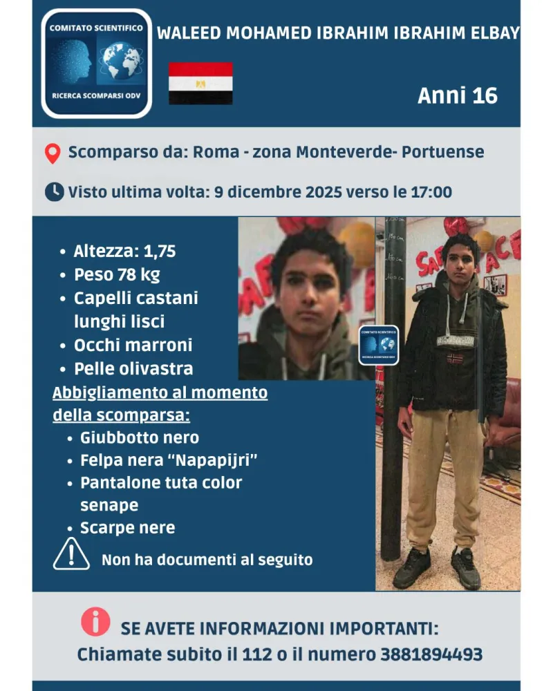 Sono ore di forte preoccupazione per Waleed Mohamed Ibrahim Elbay, il sedicenne scomparso il 9 dicembre 2025 da Roma.