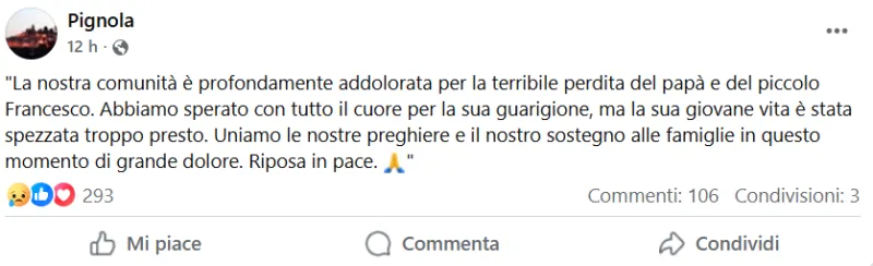 La notizia della morte del bambino ha lasciato sgomenta la comunità potentina, già colpita dal decesso del padre. L'amministrazione comunale ha espresso vicinanza ai familiari, annunciando la sospensione delle iniziative previste nei prossimi giorni in segno di lutto.