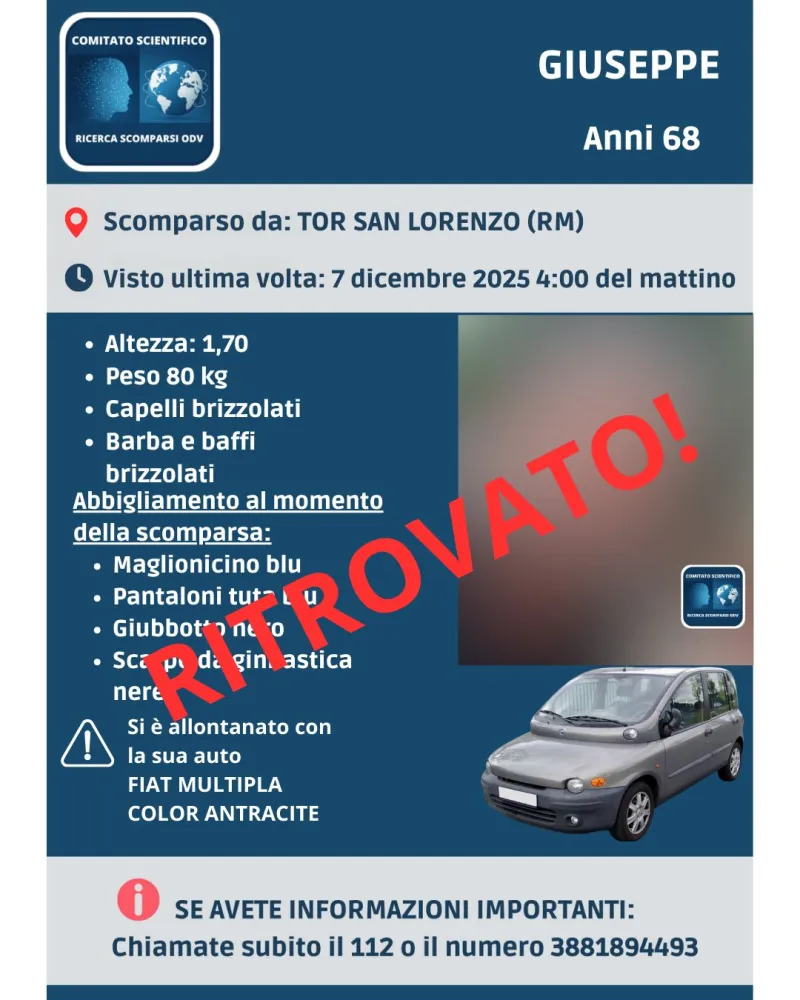 Si è conclusa con un epilogo positivo la vicenda legata alla scomparsa di Giuseppe Zacheo, scomparso il 7 dicembre 2025 da Tor San Lorenzo, nel comune di Ardea.