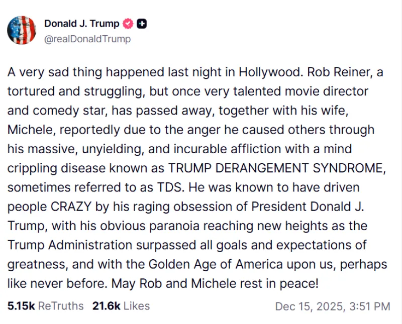 Il presidente degli Stati Uniti, Donald Trump, ha scatenato un'ondata di critiche con un post sui social che attribuisce l'omicidio dell'attore e regista Rob Reiner e di sua moglie, Michele Singer, alla loro opposizione politica nei suoi confronti. La coppia è stata trovata uccisa, il 14 dicembre 2025, nella loro casa di Los Angeles, con ferite da arma da taglio; il figlio Nick è stato arrestato il giorno successivo. La dichiarazione, definita “Sindrome da Disturbo di Trump” come causa della tragedia, rompe con la tradizione presidenziale di condoglianze, esponendo divisioni anche tra i repubblicani.