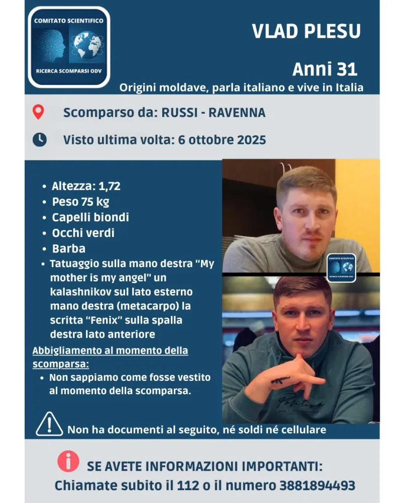 Sono ore di forte preoccupazione per Vlad Plesu, 31 anni, scomparso da Russi, in provincia di Ravenna, lo scorso 6 ottobre 2025.