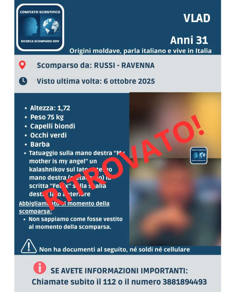Conclusione positiva per Vlad Plesu, il trentunenne scomparso da Russi, in provincia di Ravenna, lo scorso 6 ottobre 2025.
