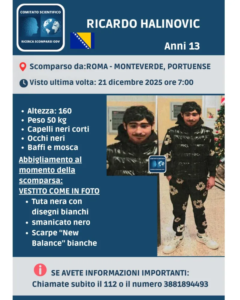 Sono ore di forte apprensione per Ricardo Halinovic, il tredicenne scomparso da Roma nella mattinata del 21 dicembre 2025.