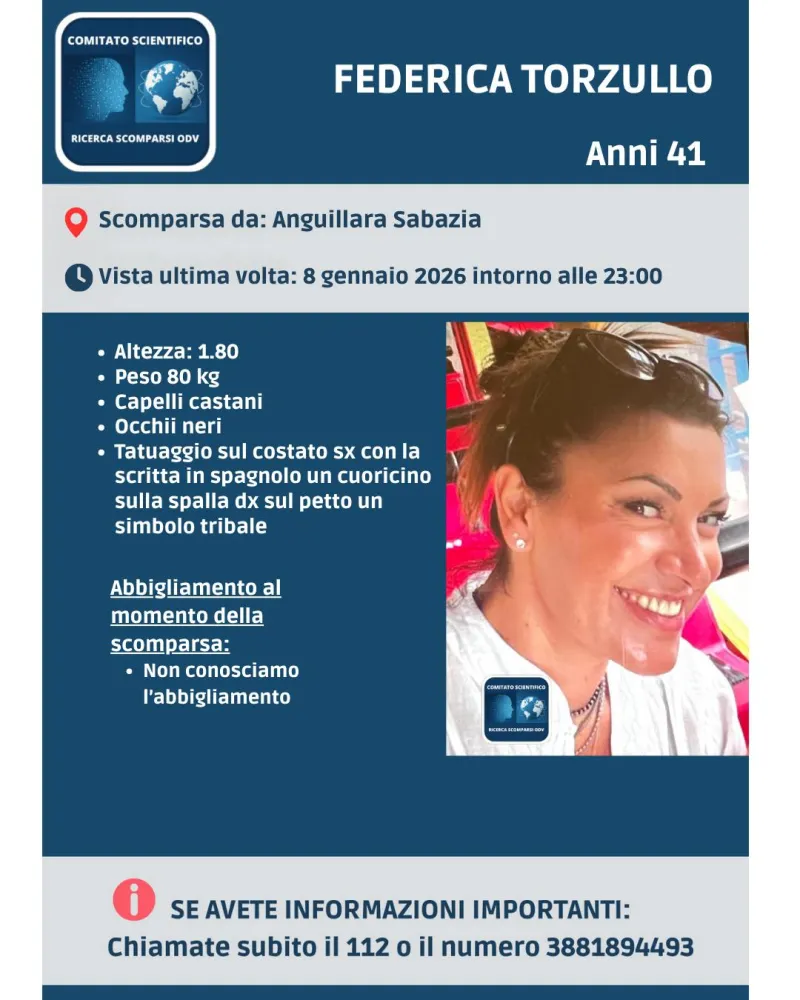 Sono ore di forte apprensione per Federica Torzullo, 41 anni, scomparsa da Anguillara Sabazia nella serata di giovedì 8 gennaio 2026.