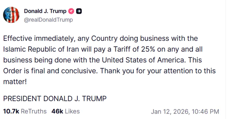 Il presidente americano ha annunciato, il 12 gennaio 2026, che i paesi che fanno affari con l’Iran dovranno affrontare dazi del 25 per cento sul commercio con gli Stati Uniti.