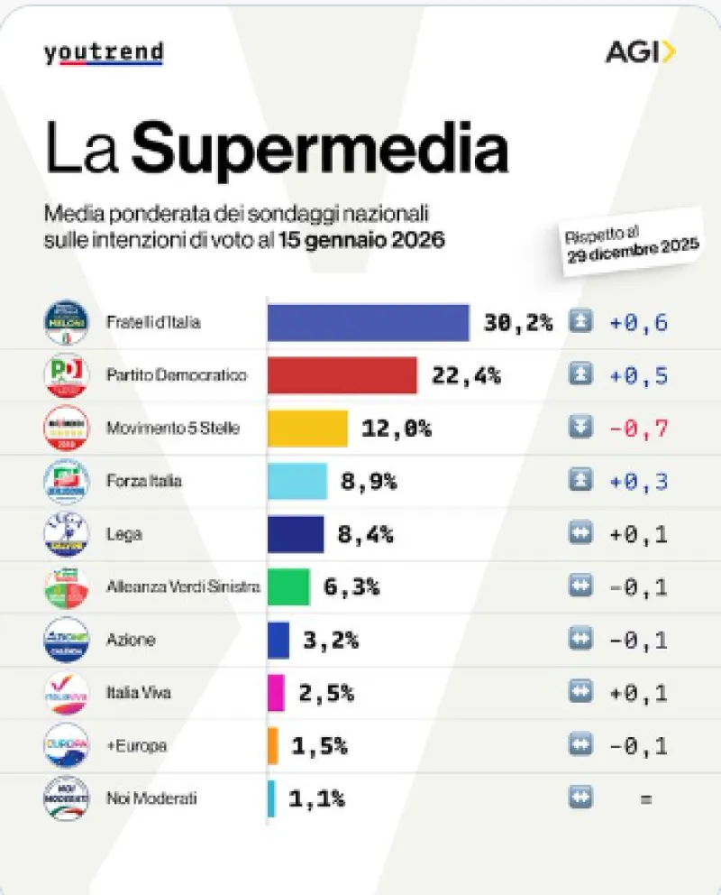 E' quanto emerso dall'ultima Supermedia YouTrend per Agenzia Italia del 2026 sulle intenzioni di voto degli italiani. I dati si riferiscono alla media ponderata dei sondaggi condotti nell'ultima settimane e raffrontati alla situazione al 29 dicembre 2025.