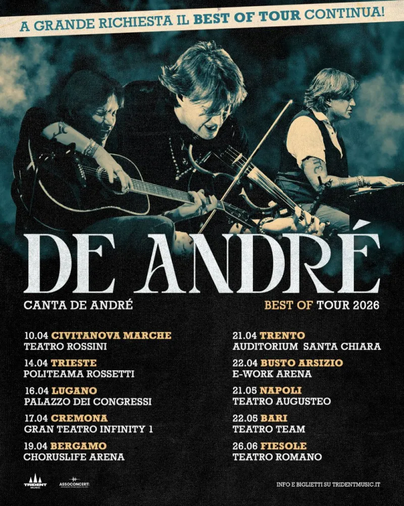 Dal mese di aprile Cristiano De André tornerà con il suo tour 2026, il “DE ANDRÉ CANTA DE ANDRÉ BEST OF TOUR 2026”, pensato come un viaggio nelle canzoni del padre.