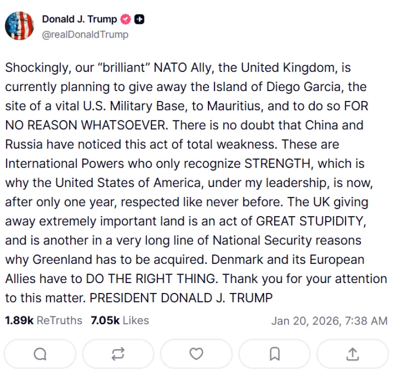 Donald Trump ha rivolto la sua attenzione sulla decisione del Regno Unito di cedere le Isole Chagos a Mauritius. In un post del 20 gennaio 2026 pubblicato sui suoi social media, Trump ha definito la decisione come un "atto di totale debolezza". Il leader americano ha poi collegato il suo desiderio di impossessarsi della Groenlandia a questa situazione.