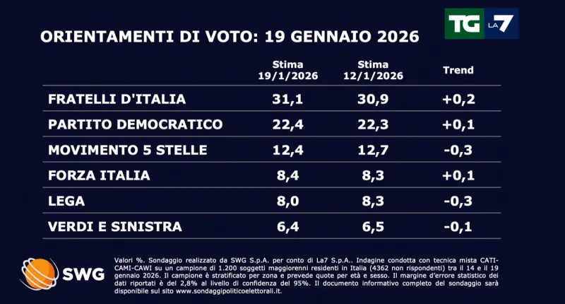 Sono queste le tendenze principali dell’ultimo sondaggio di SWG per il Tg La7 aggiornato al 19 gennaio 2026. Sullo sfondo, però, pesa un dato che continua a condizionare ogni scenario: il 32% degli elettori non esprime una preferenza, segnale di un’area di incertezza ancora molto ampia.