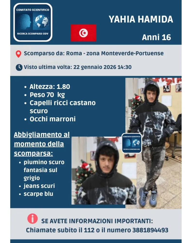 Cresce l’ansia per Yahia Hamida, un ragazzo di 16 anni sparito a Roma lo scorso 22 gennaio 2026 in circostanze allarmanti.