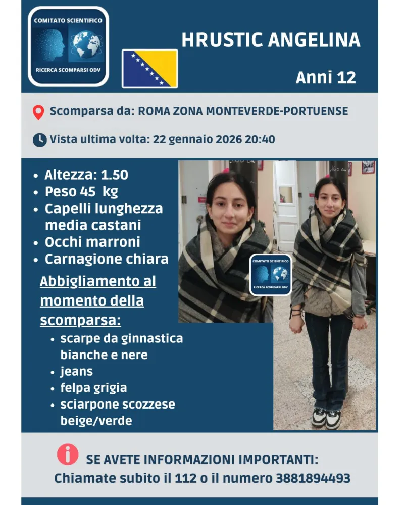 Sono momenti di grande apprensione per Angelina Hrustic, una ragazzina di 12 anni scomparsa a Roma lo scorso 22 gennaio.