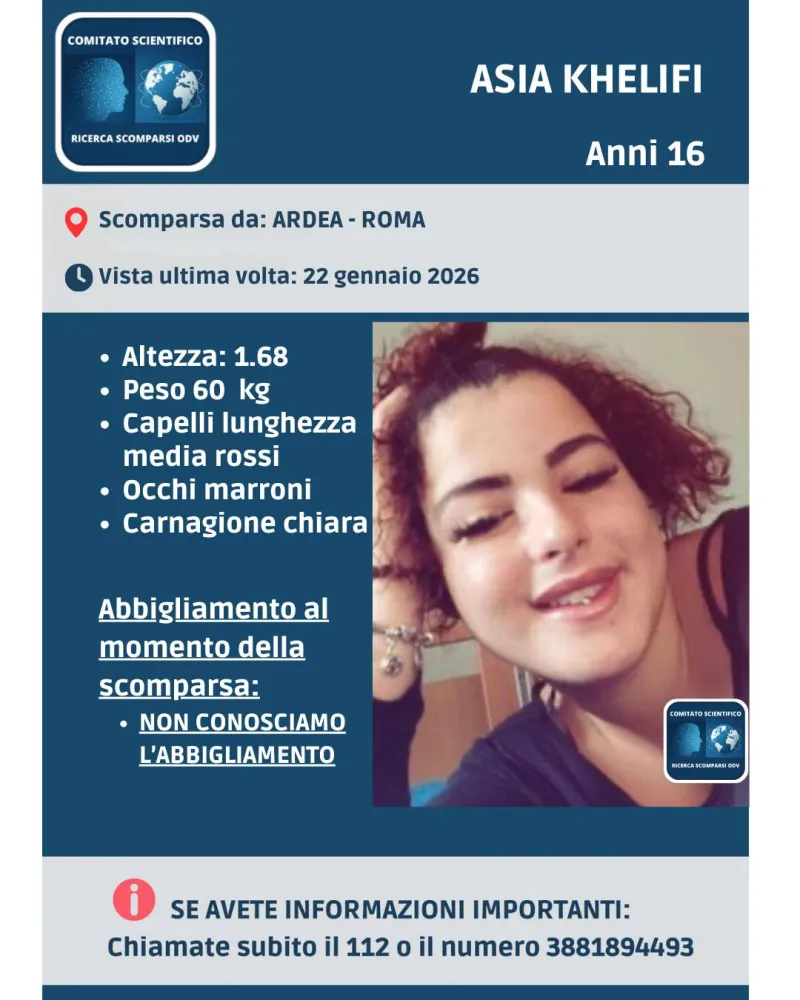 Ore d’ansia e apprensione per la scomparsa di Asia Khelifi, 16 anni, svanita nel nulla dopo essersi allontanata da Ardea, cittadina in provincia di Roma.