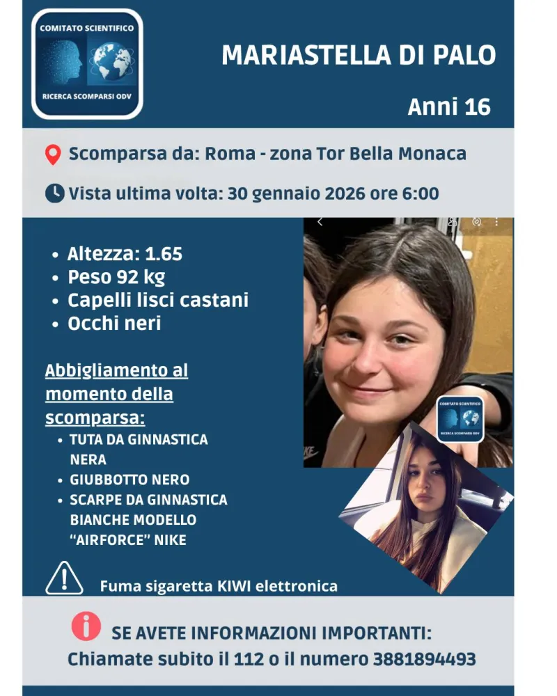 Sono ore di forte apprensione per Mariastella Di Palo, la sedicenne scomparsa da Roma il 30 gennaio 2026 in circostanze ritenute particolarmente allarmanti.