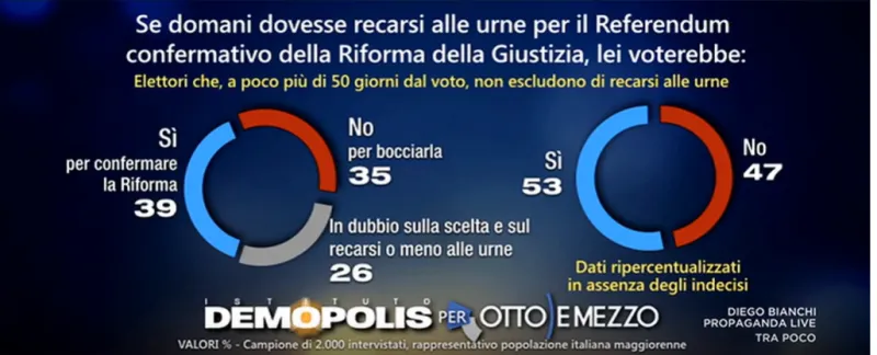 Secondo il sondaggio condotto dall’istituto Demopolis, tra il 28 e il 30 gennaio su un campione di duemila intervistati, il 39% degli italiani si dichiara orientato a votare Sì alla riforma, mentre il 35% è favorevole al No.