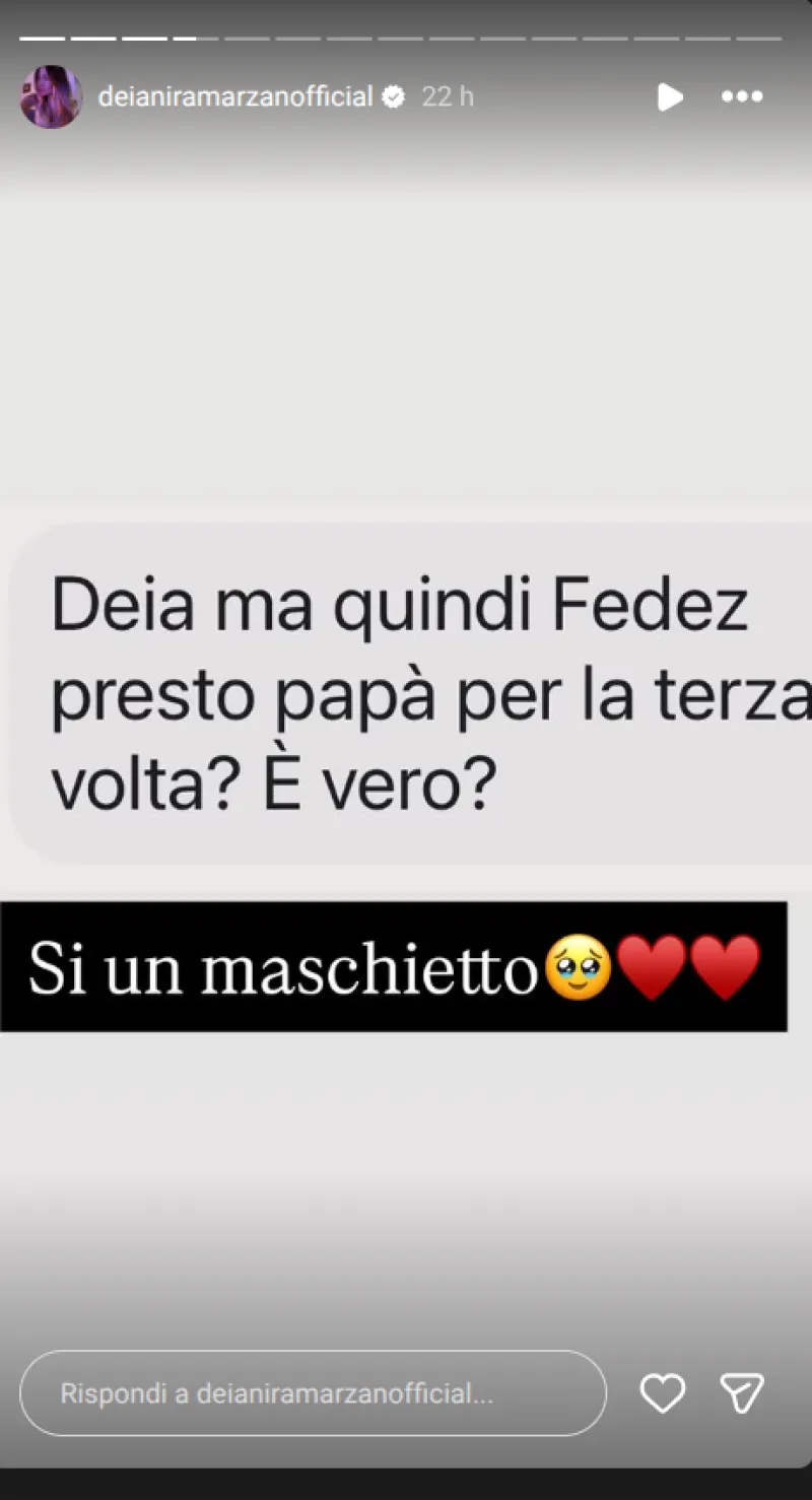 Nelle storie Instagram è lei stessa a rispondere alla domanda di un utente che le chiede se è vero che Fedez sarà padre per la terza volta, dopo i figli avuti con Chiara Ferragni.