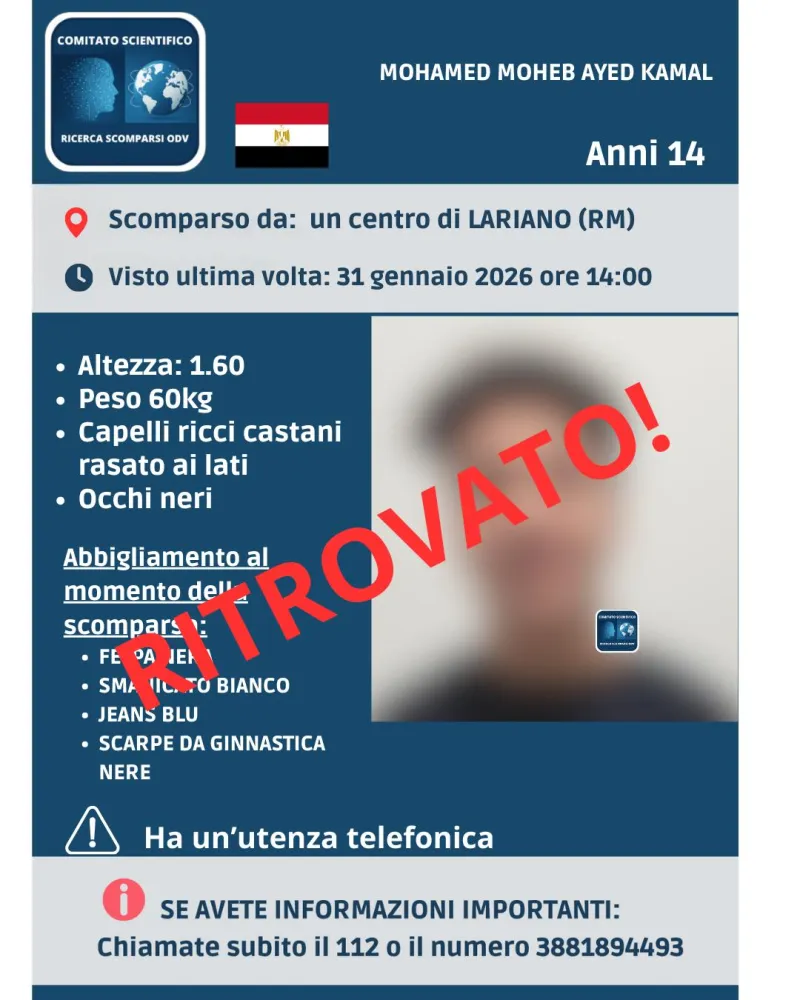 È stato ritrovato anche Mohamed Moheb Ayed Kamal Abdelmeguid, il quattordicenne che si era allontanato da un centro di accoglienza di Lariano il 31 gennaio 2026.