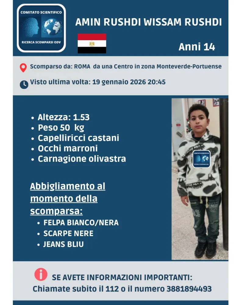 Sono ore di forte preoccupazione per Amin Rushdi Wissam Rushdi, il quattordicenne scomparso da Roma dopo essersi allontanato da un centro di accoglienza nella zona Monteverde-Portuense.