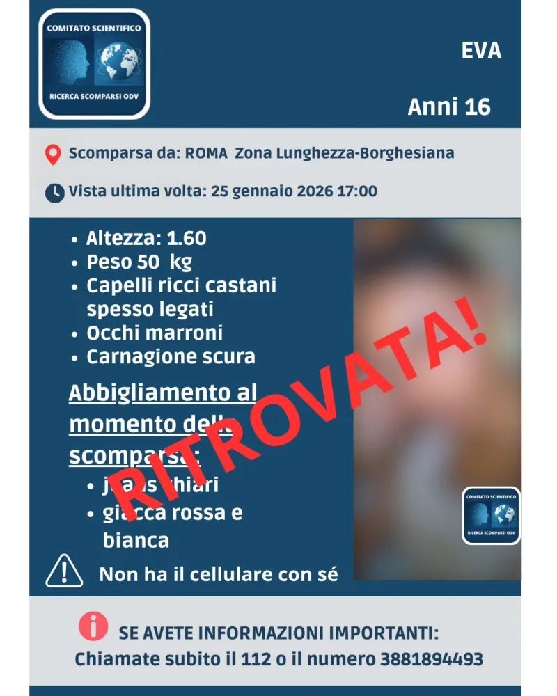 Si è conclusa con esito positivo la vicenda della scomparsa di Eva Mbaye, la ragazza di 16 anni di cui si erano perse le tracce a Roma dopo essersi allontanata da casa, nella zona Lunghezza–Borghesiana, lo scorso 25 gennaio 2026.