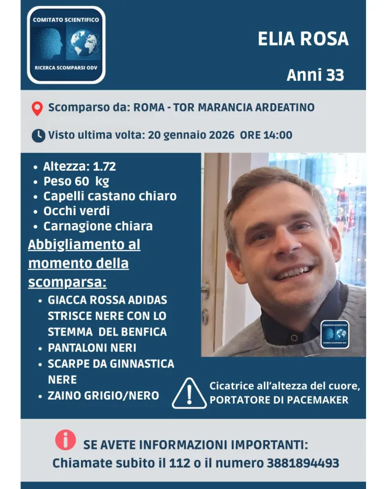Sono giorni di forte preoccupazione per le sorti di Elia Rosa, 33 anni, scomparso a Roma il 20 gennaio 2026 dopo essersi allontanato dalla casa di famiglia nella zona tra Tor Marancia e Ardeatino.