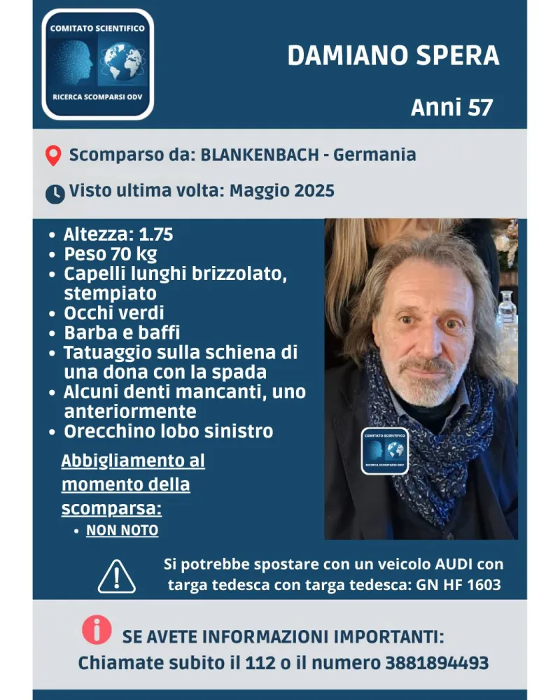 «Damiano viveva stabilmente in Germania e lavorava con regolarità. L’allontanamento improvviso senza comunicazioni è un elemento che ha immediatamente destato preoccupazione», spiegano dal Comitato Scientifico Ricerca Scomparsi OdV.