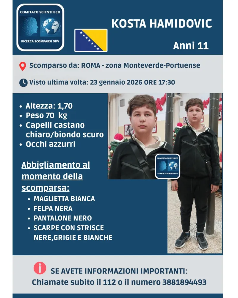 Proseguono le ricerche di Kosta Hamidovic, l’adolescente scomparso da una struttura per minori non accompagnati nella zona Monteverde-Portuense, a Roma, nel pomeriggio del 23 gennaio 2026.